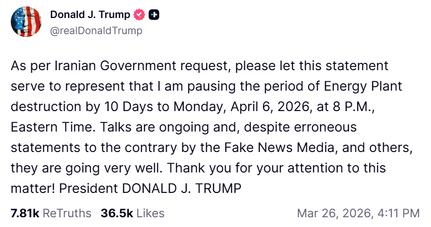 - Trump Truth Social post (March 26, 2026)