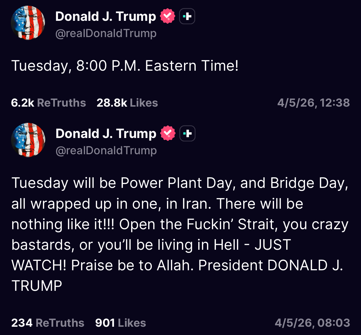 In strongly worded posts, Trump has threatened that Tuesday evening April 7 at 8 p.m. Eastern Tim will mark “Power Plant Day and Bridge Day, all wrapped up in one” in Iran if the critical waterway remains blocked. He has repeatedly stated that failure to comply would result in the destruction of Iran’s energy infrastructure and transportation network, warning the Iranian leadership that the country could be “taken out in one night” and its people left “living in Hell.”