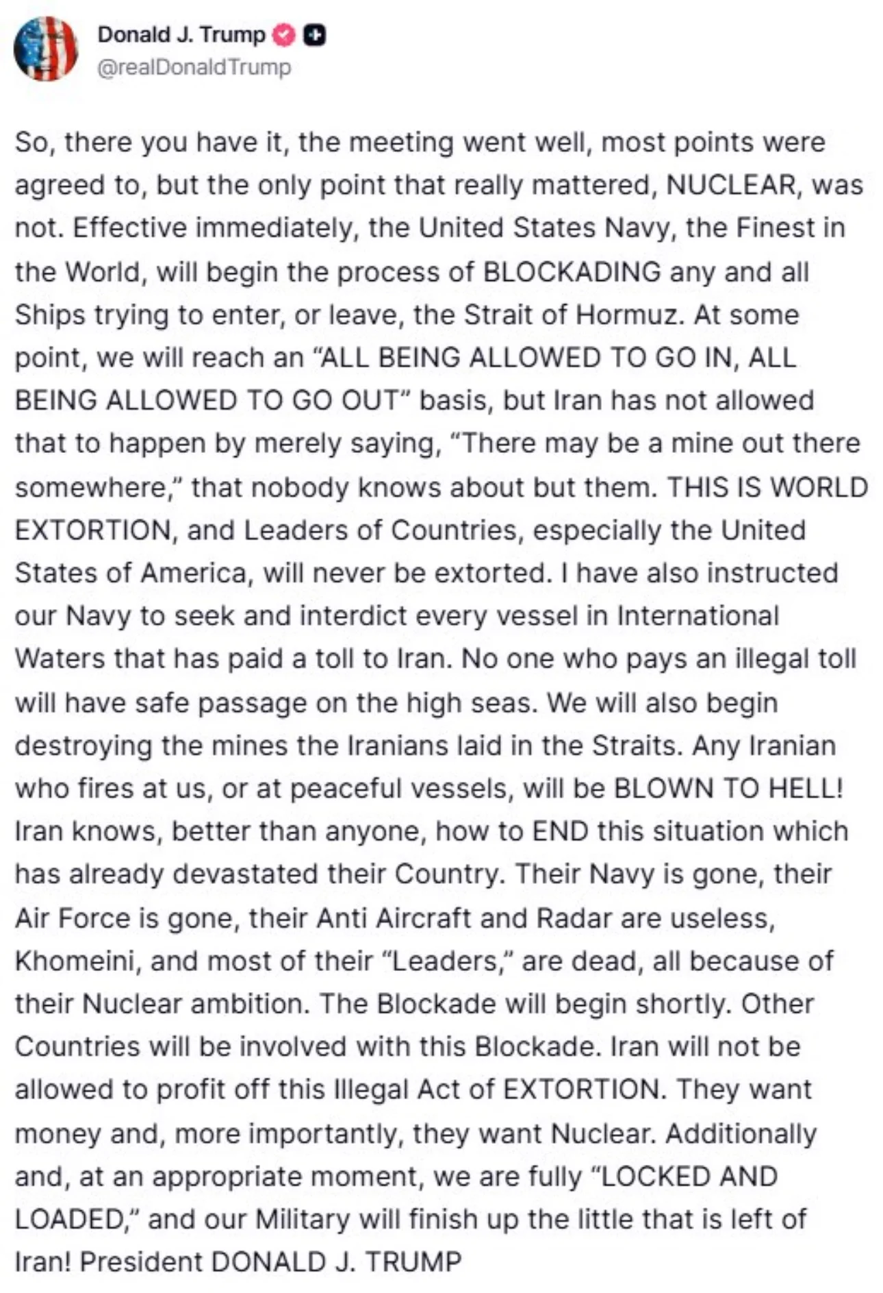 The United States Navy will begin enforcing a full naval blockade of the Strait of Hormuz at 10:00 a.m. Eastern Time today, President Donald J. Trump announced. The operation follows Iran’s refusal to open the critical waterway and its continued insistence on maintaining its nuclear program.